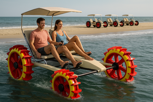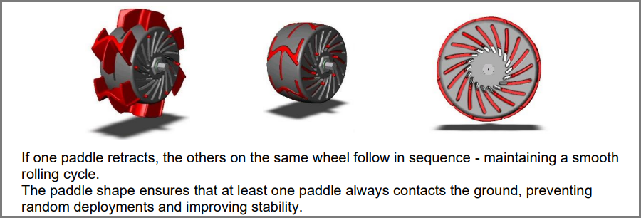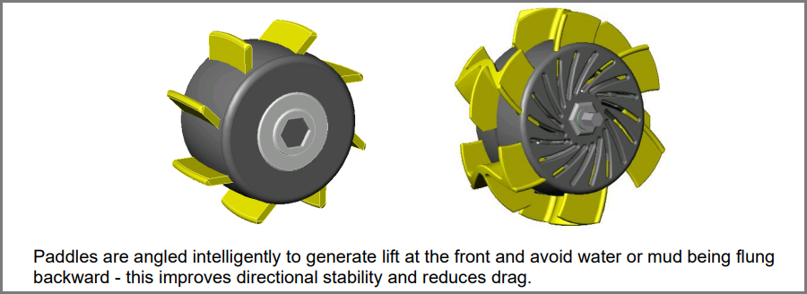 | - | Hydrodynamic Lift: Thanks to the subtle tilt of the paddles, an upward force is generated, lifting the vehicle and reducing drag: t’s as if your wheels have invisible wings! This lift pulls vehicles out of mud or sand and minimizes water resistance as speed increases.