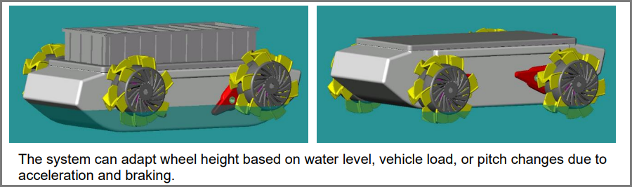 | - | Controlled Aquaplaning: At higher speeds, ARWIMS turns the undesirable phenomenon of aquaplaning into an advantage. The tilted paddles allow the vehicle to glide on water, with its surface resistance becoming comparable to concrete. Yes, you read that right: driving at high speed on water is now a reality!