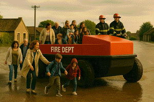 Flooded city? No problem - the fire brigade shows up on a barge, full throttle on wheels. No propellers to break on hidden debris... | ||
