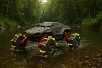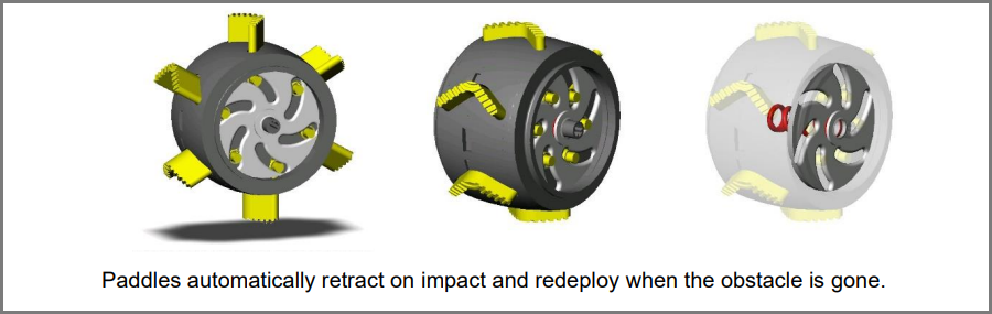 | - | Hydrodynamic Lift: Thanks to the subtle tilt of the paddles, an upward force is generated, lifting the vehicle and reducing drag: t’s as if your wheels have invisible wings! This lift pulls vehicles out of mud or sand and minimizes water resistance as speed increases.