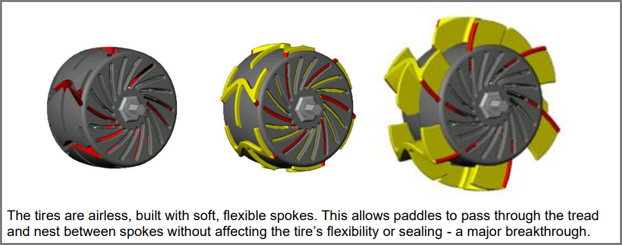 These are not ordinary tires. They are equipped with retractable paddles that deploy on soft terrain or water and retract on hard surfaces, along with a dynamic tread system that adjusts in real time to optimize grip and efficiency.