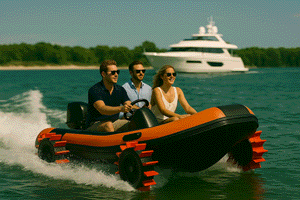 No need to wait for the patrol boat or deploy a dinghy. This special unit drives on water and pavement alike.