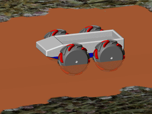 | Instead of seeing its tracks sink into the mud, the vehicle frees itself by modifying the angular sector in which the paddles exit the wheel. |